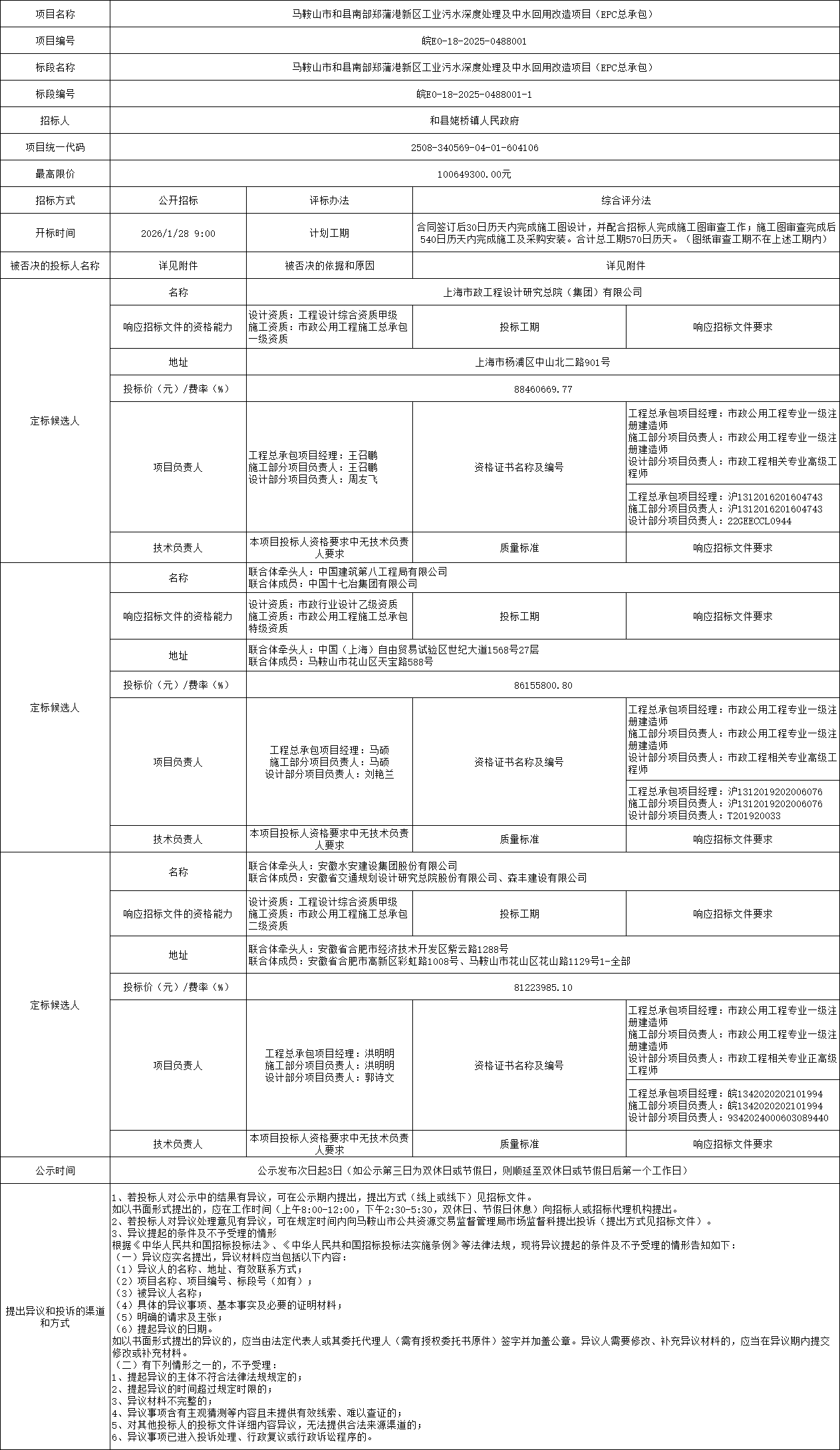 定標候選人:上海市政工程設計研究總院(集團)有限公司,投標報價:88460669.77元;