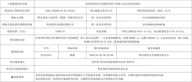 貴州爐碧經(jīng)開區(qū)循環(huán)經(jīng)濟產(chǎn)業(yè)園工業(yè)污水治理項目項目招標計劃