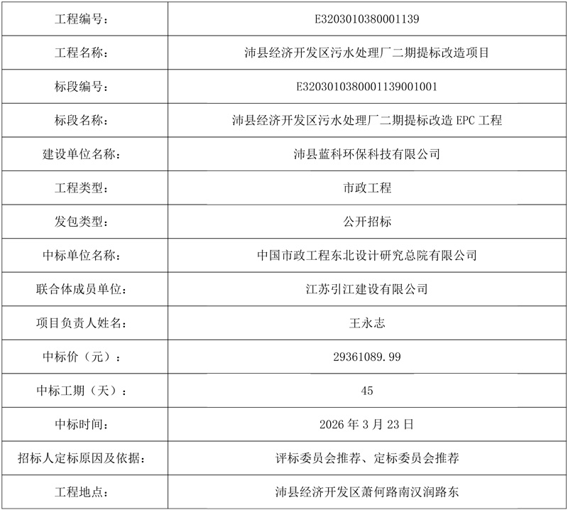 沛縣經(jīng)濟開發(fā)區(qū)污水處理廠二期提標(biāo)改造EPC工程中標(biāo)結(jié)果公告