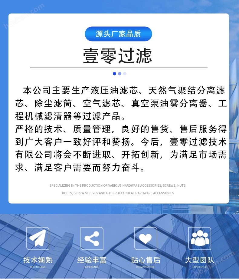 我公司生產替代國內外各種品牌壓縮機進氣除塵濾芯、油過濾芯、油氣分離濾芯,粉塵濾芯系列,進口壓縮氣體高效過濾器國產化系列濾芯(包括加氣站設備濾芯),紙濾苾、吸濾苾、除水濾苾、除油濾芯、除菌濾、絮狀物過濾器及濾芯、磁石濾、凈化機濾芯、濾油機濾芯、油水分離濾芯線綿式濾芯、重油除油除水微孔不銹鋼濾。陶瓷燒結式濾芯、玻璃纖維燒結濾芯、金屬粉未燒結濾芯、不銹鋼燒結網濾芯、木質纖維壓結濾芯、聚結式水中分油濾芯和水油分離器、油水分離濾網、脫水凈油濾油機、煤氣聚結式過濾器、油尾氣凈化器,干燥機,除油器,精過濾器,液體過濾器,濾油機及各種液體氣體自動反沖(吹)洗過濾芯等幾十種系列上萬種產品。 工業(yè)氣體、環(huán)保設備用的除塵濾芯、除塵濾筒、除塵濾袋、粉塵濾芯、除菌、除味濾芯及粉塵回收濾芯。工業(yè)用油、流體動力設備、液壓、潤滑系統、高精度油過濾器濾管路濾芯、進口濾芯國產化改造,非標濾芯的研制與生產。