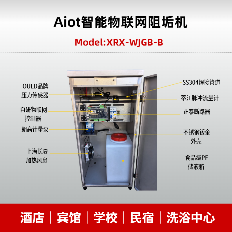 欣榮欣在智能阻垢機(jī)項(xiàng)目上累計(jì)投入超100萬(wàn)元,在濟(jì)南總部設(shè)立智能阻垢機(jī)組裝廠,同時(shí)在安徽蕭縣設(shè)立水處理阻垢劑生產(chǎn)基地,實(shí)現(xiàn)從核心算法到硬件生產(chǎn)的全鏈路自主研發(fā)。公司打造了覆蓋開關(guān)型、第二代流量型、第三代IOT物聯(lián)網(wǎng)流量型、第四代AIOT物聯(lián)網(wǎng)流量壓力雙疊加態(tài)智能型的全系列產(chǎn)品,可滿足不同規(guī)模、不同定位酒店的多樣化水垢防控需求。其中第四代AIOT智能物聯(lián)網(wǎng)阻垢機(jī)為品牌拳頭產(chǎn)品,擁有不銹鋼外殼、冷軋板靜電噴塑外殼兩類材質(zhì)選擇,適配不同酒店的安裝環(huán)境與品質(zhì)需求。產(chǎn)品系列分為XRX-WJGB系列、XRX-JGB1系列、XRX-JGB2系列。其中XRX-WJGB系列作為核心的智能物聯(lián)網(wǎng)款酒店水垢防控機(jī)組,涵蓋DN25至DN150多種型號(hào),流量覆蓋1噸-200噸每小時(shí),可無(wú)縫適配從精品民宿到大型星級(jí)酒店的不同熱水系統(tǒng)規(guī)模,成為酒店水垢防控的核心選擇。